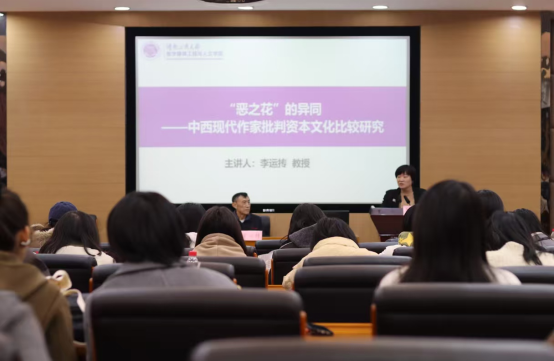 12月10日,广西民族大学李运抟教授应邀来校主讲麓山“数字传媒与人文”学术论坛第四十讲,讲座主题为“恶之花”的异同——中西现代作家批判资本文化比较研究。讲座在至诚楼A309报告厅举行,由数字媒体工程与人文学院执行院长彭文忠教授主持,中文专业本科生、研究生聆听了讲座。