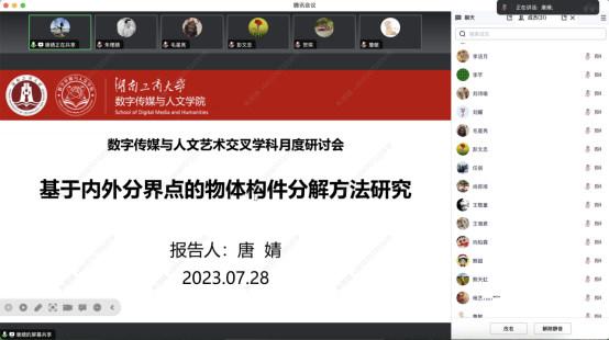 2023年7月28日上午,数字传媒与人文艺术交叉学科群7月月度研讨会顺利召开,本次研讨会由数字传媒与人文学院智能媒体计算学科方向承办,任剑、彭文忠、文兰芳等学科方向负责人以及各学科方向骨干共计70余人参加了此次研讨会。