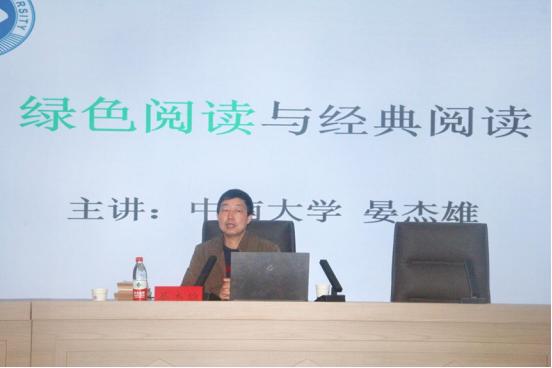 讲座伊始,晏杰雄教授首先引用孔子的话“不学诗,无以言”阐明阅读的重要性,引出话题“绿色阅读”。接着,教授以己为例,讲述了自身在大学时期与《金蔷薇》的故事,分享了自己在低谷时期被书中人物激励、重拾自我,于困境中激发潜力的经历。他着重强调绿色阅读的“十六字方针”——“经典阅读,纸质阅读,深度阅读,健康阅读”。接着,晏教授分别介绍了中国古代文学的经典丛书和80年代颇具影响力的外国书籍,并向在座的师生们推荐了十部经典作品。最后,教授用“读书,这么好的事”激励同学们多读书、读好书。