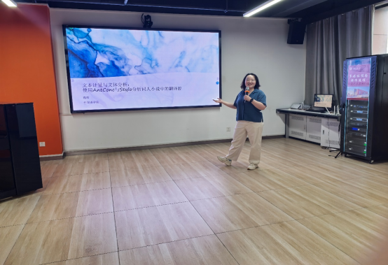 蒋晔博士作了《文本计量与文体分析:使用 AntConc 与 Stylo 分析同人小说中的翻译腔》主题报告,她介绍了同人小说与翻译腔的概念,并对所使用的研究方法进行介绍,分享了AntConc 与 Stylo 在文本分析方面的特点与差异。对研究所使用的语料库的建设情况以及AntConc 与 Stylo 分析的相关词汇评率进行了探讨。