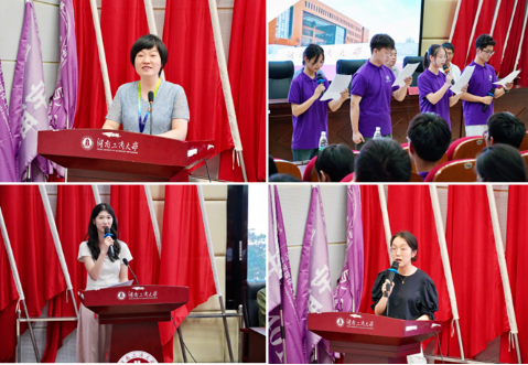 随后,四位新生代表——智媒体2401班的李昱瑾、元宇宙2401的石欣悦、新传2401班的邓雅轩和新传2402班的钦胤笛同学相继发言。他们鼓励同学们以积极向上的态度,将“至诚至信、为实为新”的校训精神印刻于心、践之于行,共同书写精彩的大学生活篇章。作为老生代表,来自中文2201班的陈宇婷同学上台发表精彩讲话。她强调大学是追求知识与自我发现的重要时期,鼓励新生早规划、夯实基础,为未来深造或职场启航打基础。