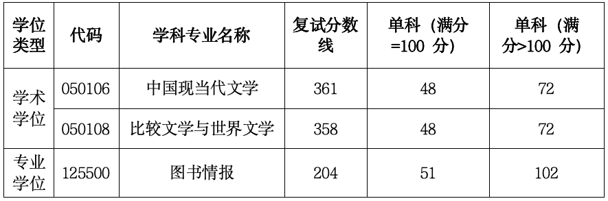复试内容主要包括三个方面:一是专业理论基础测试:中国语言文学学术硕士、新闻与传播专业硕士的专业理论基础测试,分值150分;图书情报专业硕士的专业理论基础测试包括专业理论和政治两部分,分别进行,其中专业理论100分,政治50分;二是综合素质及能力测试,分值100分;三是外语能力测试,分值50分。复试总成绩300分。根据考生复试成绩实际情况确定合格标准,复试三个方面中任何一个方面成绩不合格的考生不予录取。