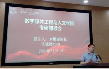 2024年5月21日下午,至诚楼A309,数字媒体工程与人文学院举办全国优秀大学生暑期夏令营第一期活动,200名师生参加。执行院长任剑教授作“为何要考研?”的主题报告,结合全球科技发展态势、国家政策、湖南“三高四新”战略、湖工商“三进三高”目标以及严峻的就业形势、社会对高质量人才的迫切需要,分析大学生为何要考研?他介绍学校顺应数字经济时代发展趋势,求新求变,实现跨越式发展,教学、科研、校园建设成绩斐然,声誉日隆。他建议同学们审时度势,明智选择,积极报考湖工商数文学院。